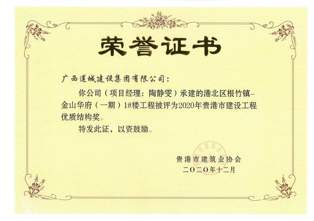 2020年貴港市建設(shè)工程優(yōu)質(zhì)結(jié)構(gòu)獎(jiǎng)港北區(qū)根竹鎮(zhèn)-金山華府(一期)2#、3#、5#、6#樓工程,陶靜雯
