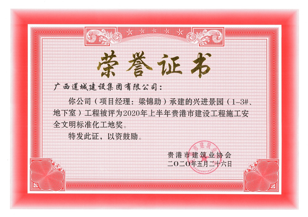 2020年上半年貴港市安全文明工地(市級(jí))興進(jìn)景園(5#、7#樓)工程,項(xiàng)目經(jīng)理:梁錦助