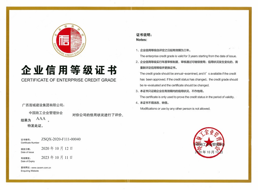 中國(guó)企業(yè)信用等級(jí)證書AAA
