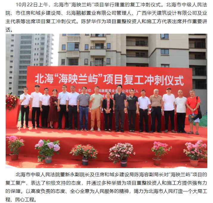 10月22日上午,北海市“海映蘭嶼”項目舉行隆重的復(fù)工沖刺儀式。北海市中級人民法院、市住房和城鄉(xiāng)建設(shè)局、北海融都置業(yè)有限公司管理人、廣西華天建筑設(shè)計有限公司及業(yè)主代表等出席項目復(fù)工沖刺儀式。...