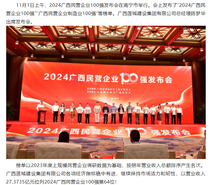 穩(wěn)中有進!蓮城建設(shè)集團蟬聯(lián)2024廣西民營企業(yè)百強榜單!