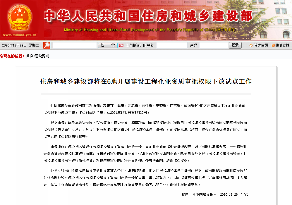 住房和城鄉(xiāng)建設部日前下發(fā)通知,決定在上海市、江蘇省、浙江省、安徽省、廣東省、海南省6個地區(qū)開展建設工程企業(yè)資質審批權限下放試點工作。試點時間為半年,從2021年1月1日至6月30日。根據通知,除最高等級資質(綜合資質、特級資質)和需跨部門審批的資質外,將原由住房和城鄉(xiāng)建設部負責審批的其他資質審批權限(包括重組...