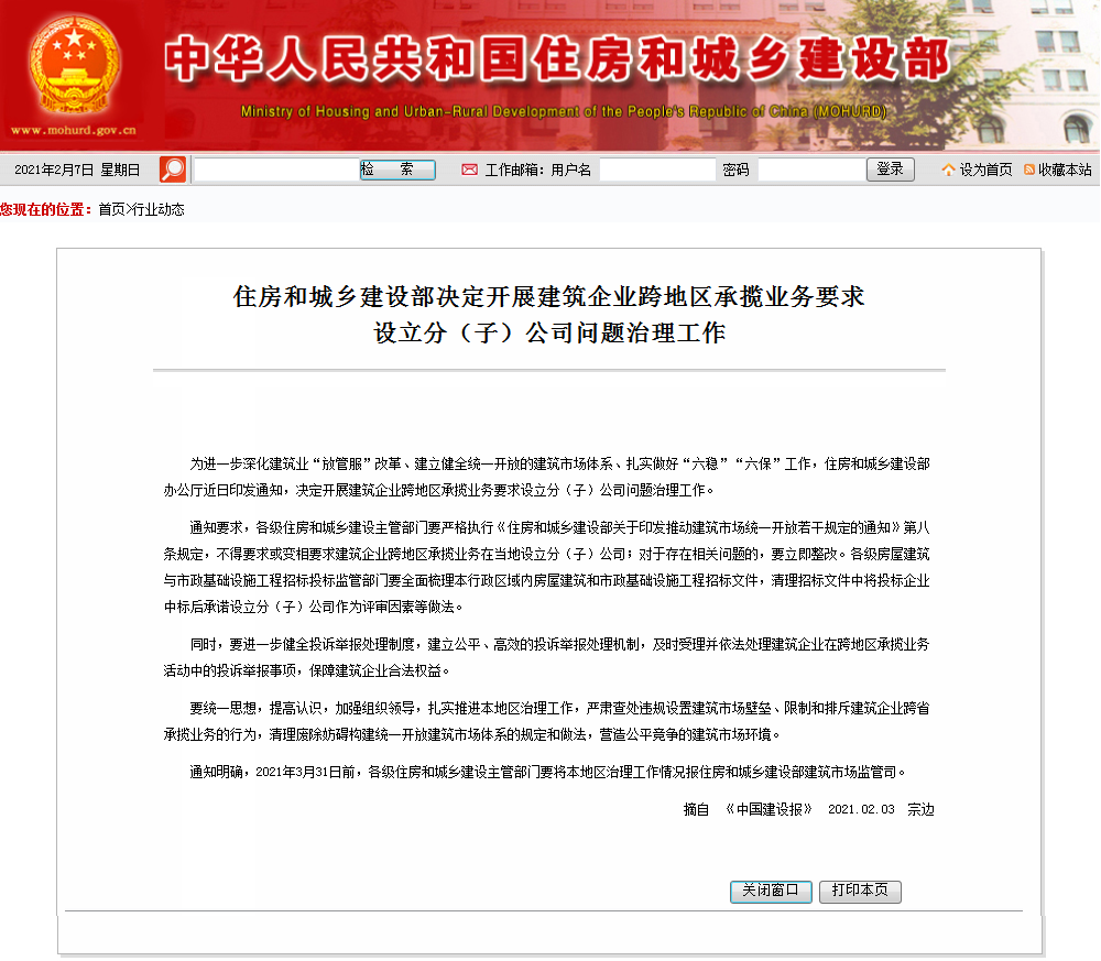 設立分(子)公司問題治理工作 為進一步深化建筑業(yè)"放管服"改革、建立健全統一開放的建筑市場體系、扎實做好"六穩(wěn)""六保"工作,住房和城鄉(xiāng)建設部辦公廳近日印發(fā)通知,決定開展建筑企業(yè)跨地區(qū)承攬業(yè)務要求設立分(子)公司問題治理工作。 通知要求,各級住房和城鄉(xiāng)...