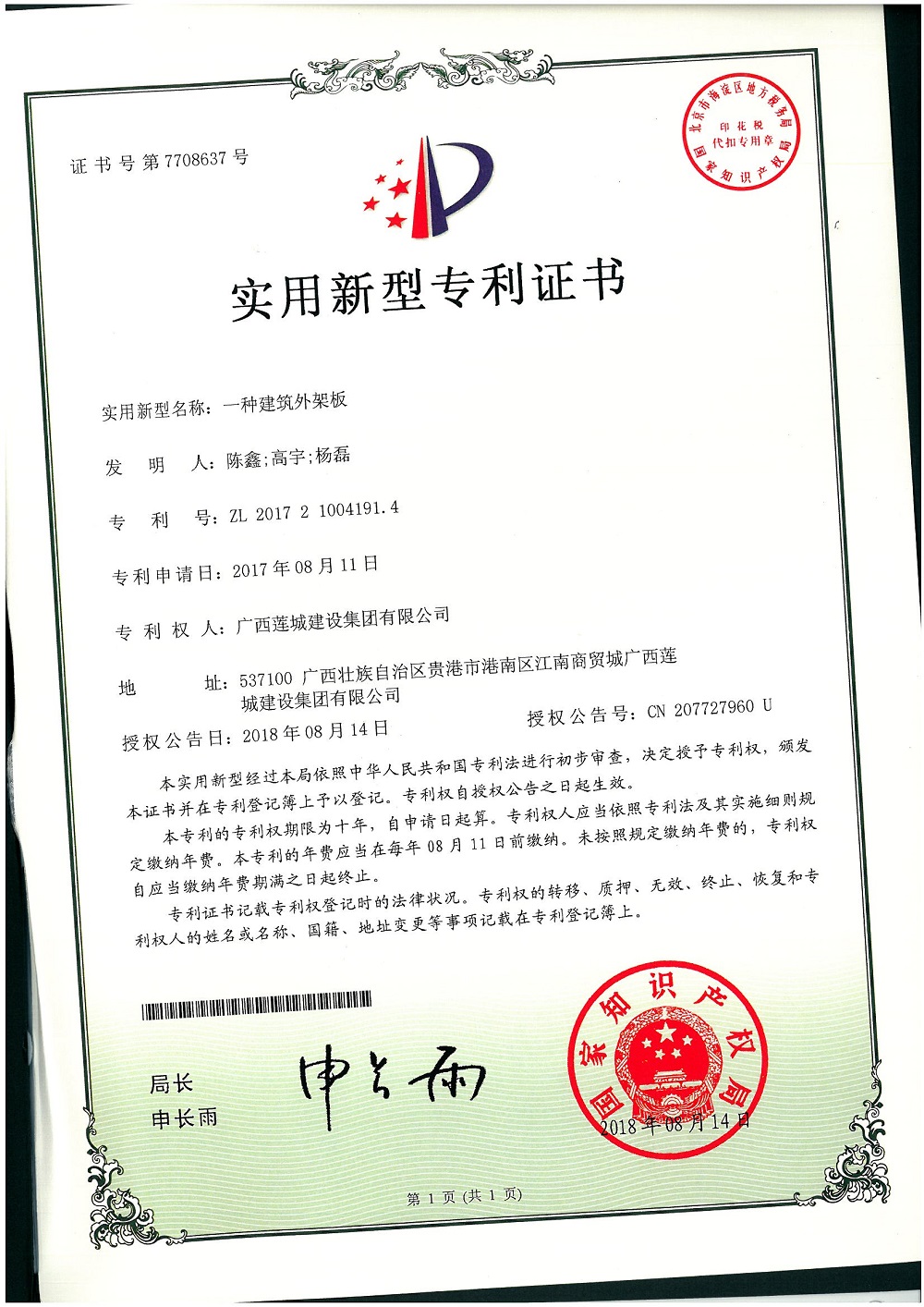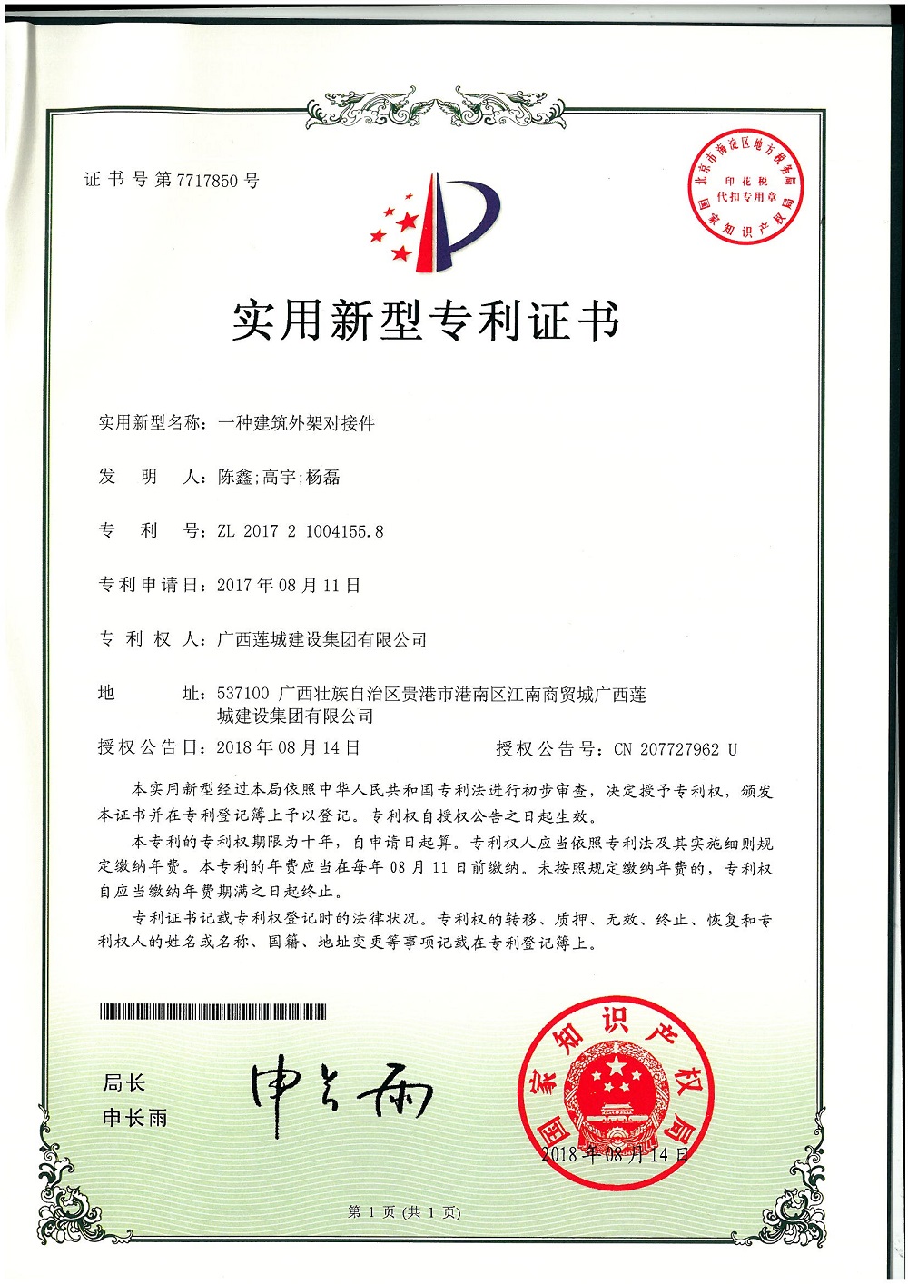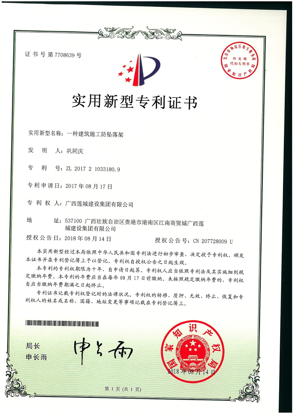 (一種建筑施工防墜落架)實(shí)用新型專利證書