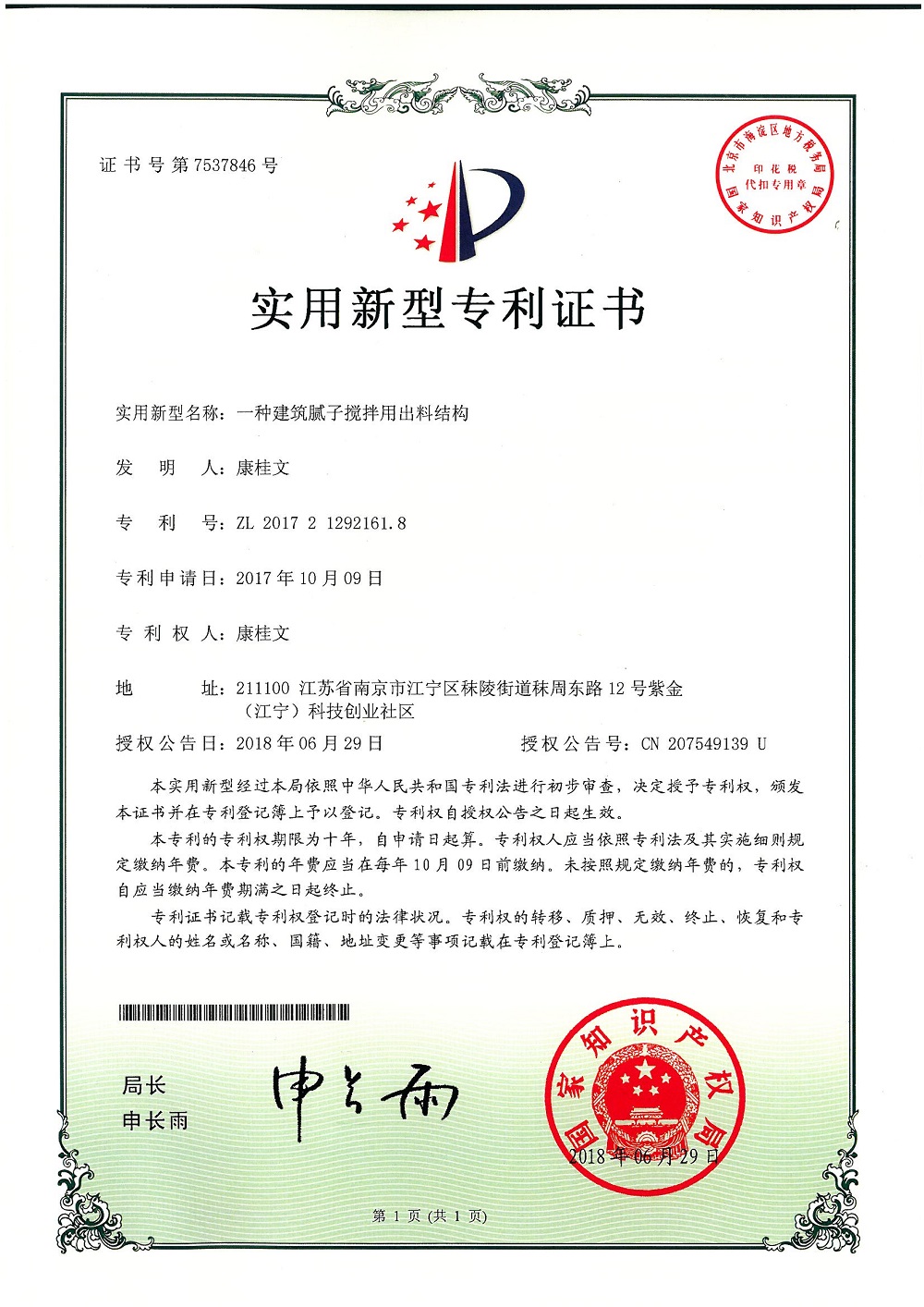 (一種建筑膩?zhàn)訑嚢栌贸隽辖Y(jié)構(gòu))實(shí)用新型專利證書