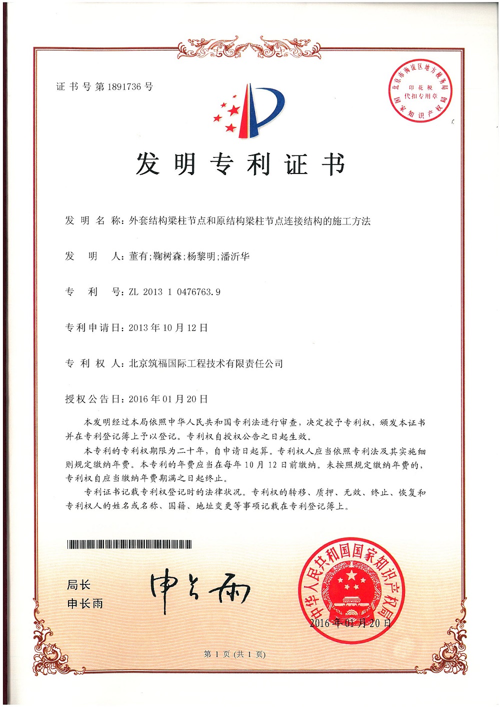 (外套結(jié)構(gòu)梁柱節(jié)點(diǎn)和原結(jié)構(gòu)梁柱節(jié)點(diǎn)連接結(jié)構(gòu)的施工方法)發(fā)明專利證書